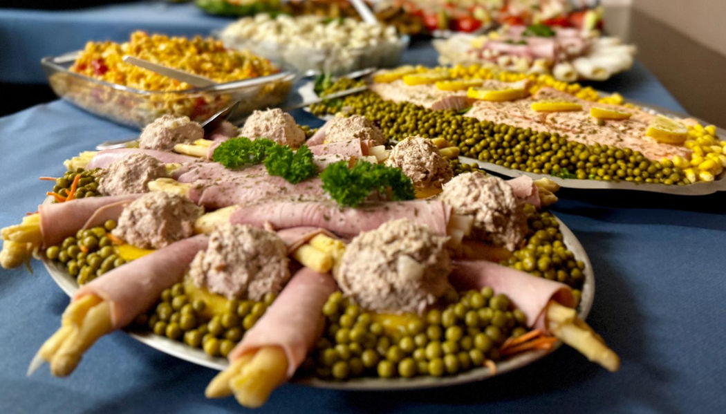 groentenassortiment (salade, bloemkool, erwten, komkommer, maïs, wortelen, boontjes, eitjes) - aardappelsalade - pastasalade - meloen met gerookte ham - kippenwit - asperges ingerold met ham - kippenbout - perzik met huisgemaakte tonijnsalade - gerookte zalm - scampi - tomaat gevuld met rivierkreeftjes - koude sauzen - broodassortiment - boter